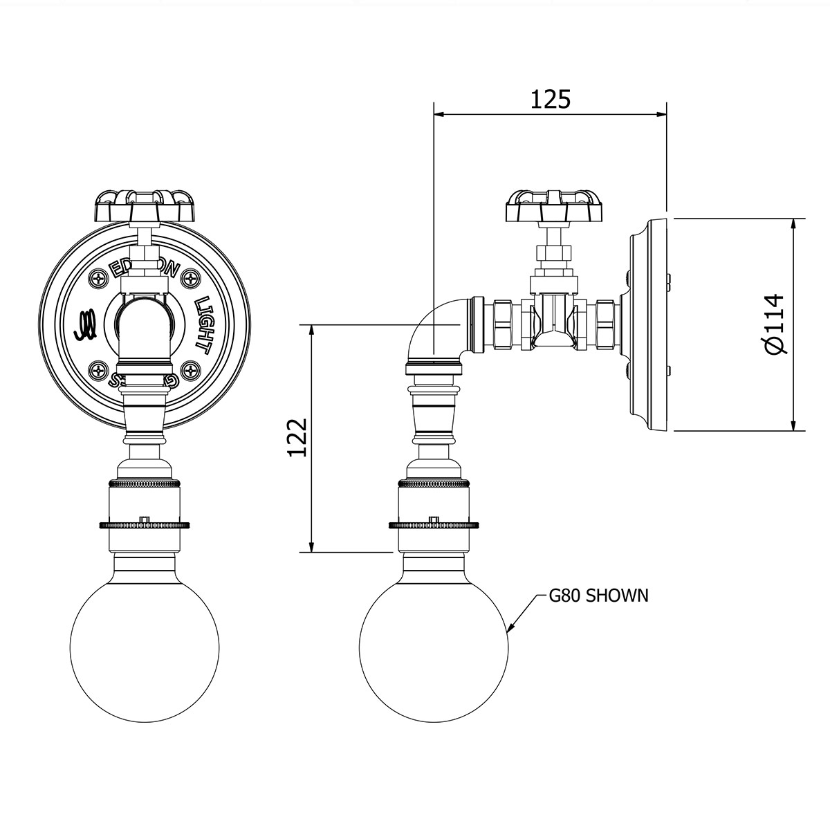 Plumbing pipe tap wall light. This light fittingย can be used in rows to light up a passage way or as a focal point above tables. This Plumbing pipe tap wall light may also be used to light up signage or paintings. It secures to the wall via an ELG branded cast flange. The bulb here is an 80mm spiral spherical. This would be a useful addition where lighting beside a doorway or entrance/exit internally.